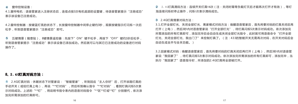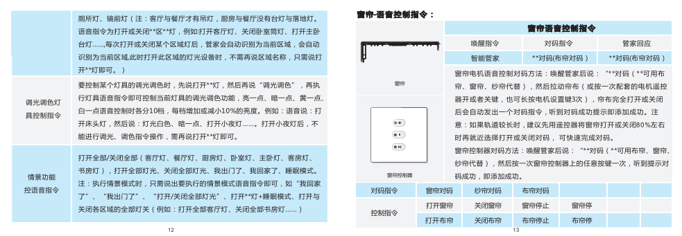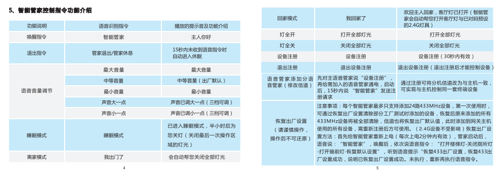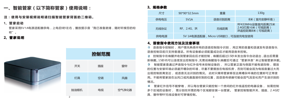 智能管家在無(wú)遠(yuǎn)程網(wǎng)絡(luò)的情況下可通過(guò)添加設(shè)備自組無(wú)線局域網(wǎng),用語(yǔ)音指令來(lái)控制打開(kāi) 或關(guān)閉室內(nèi)的開(kāi)關(guān)、插座、窗簾等電氣設(shè)備,還可以通過(guò)語(yǔ)音指令操控具有紅外遙控功能的電 視、空調(diào)、風(fēng)扇、抽油煙機(jī)等家用電器,語(yǔ)音操作對(duì)碼,操作簡(jiǎn)單,安裝方便,通過(guò)簡(jiǎn)單的 對(duì)碼設(shè)置還可以用智能遙控器對(duì)智能開(kāi)關(guān)、插座等設(shè)備實(shí)現(xiàn)單控、互控、群控、情景聯(lián)動(dòng)等, 方便各類人群使用。通過(guò)增配無(wú)線智能網(wǎng)關(guān)可以實(shí)現(xiàn)手機(jī)或其它網(wǎng)絡(luò)終端設(shè)備遠(yuǎn)程控制功能, 不管你在何處,只要有網(wǎng)絡(luò)的地方都可通過(guò)APP來(lái)遠(yuǎn)程控制家里的智能開(kāi)關(guān)、窗簾、插座的開(kāi) 關(guān)等設(shè)備,還具有強(qiáng)大的安防功能,可增配門磁報(bào)警器、紅外報(bào)警器、煙霧報(bào)警器、燃?xì)鈭?bào)警 器、聲光報(bào)警器、電磁閥、攝像頭、智能鎖等智能安防設(shè)備,可對(duì)室內(nèi)的門窗及各區(qū)域?qū)嵤┎?nbsp;防、監(jiān)控、智能開(kāi)鎖等。